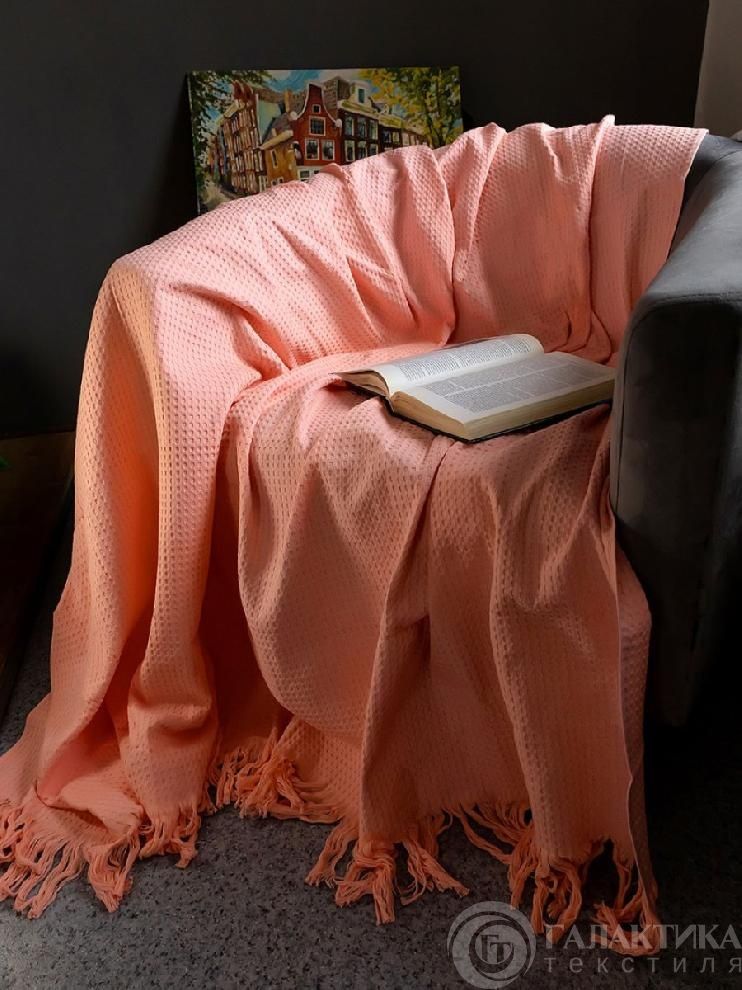 Однотонное покрывало приятного розового цвета из вафельного полотна придаст спальне или гостиной нотки спокойствия и легкости.